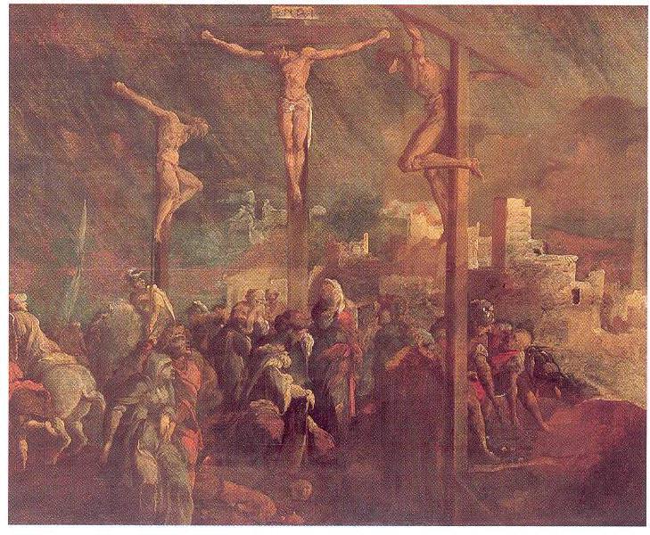 Le panneau est dominé par les silhouettes crucifiées du Christ et des deux larrons. Bien sur celle du Christ domine et marque l'axe central de la composition. A sa droite malgré un raccourci hardi, le larron de profil semble s'incliner comme celui de gauche. A leurs pieds des silhouettes à peine définies sont frappées par l'atmosphère ténébreuse et les architectures de l'arrière plan apparaissent fantômatiquement.
