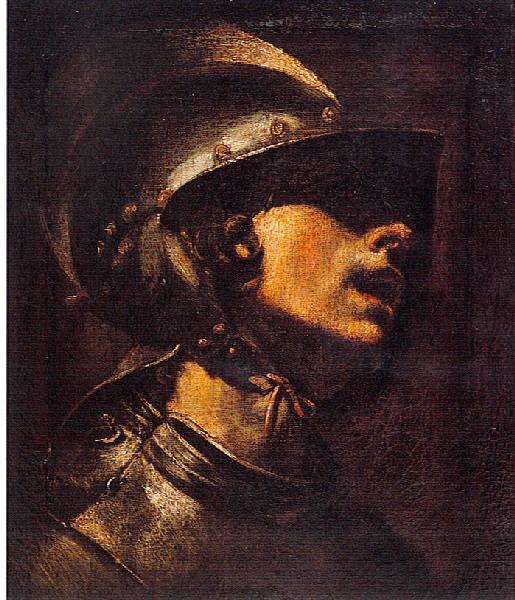 Nous sommes vraisemblablement devant un fragment de tableau ce dont les bords effilochés de l'oeuvre attestent. C'est la tête d'un jeune soldat casqué qui se détache traitée dans un camaïeu de bruns. L'éclairage puissant, venant de la gauche, souligne le modelé de la partie inférieure du visage, une boucle de cheveux et l'éclat du métal du morion et du gorgerin.