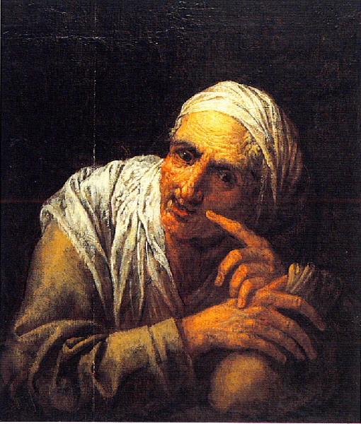 Type populaire féminin, présenté à mi-buste, la main droite tenant une sorte de rave et la gauche le doigt point nous prenant à témoin. Agée, ses cheveux blancs sont dissimulés sous un drapé blanc et ses traits marqués soulignés par le blanc du châle qui couvre les épaules de sa robe ocre. Comme pour le portrait d'homme palette monochrome d'ocres et de blancs.