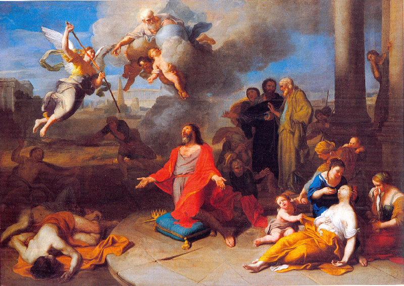 David au centre de la composition vêtu d'un manteau rouge est agenouillé sur un coussin bleu sa couronne et son sceptre royal à côté sur le sol. Les bras écartés, il implore Dieu au-dessus de lui qui apparaît surgissant d'un nuage soutenu par 3 angelots et qui pointe son bras droit vers le grand ange qui s'apprête à ranger son grand glaive de feu dans son fourreau. A droite, derrière David, un groupe d'hommes discute; à terre deux femmes secourent une 3e étendue qu'un enfant pleure. A gauche, des corps masculins gisent et un personnage s'enfuit en se bouchant le nez. A l'arrière plan, obélisque et colonnade évoquent l'antiquité et l'Egypte.