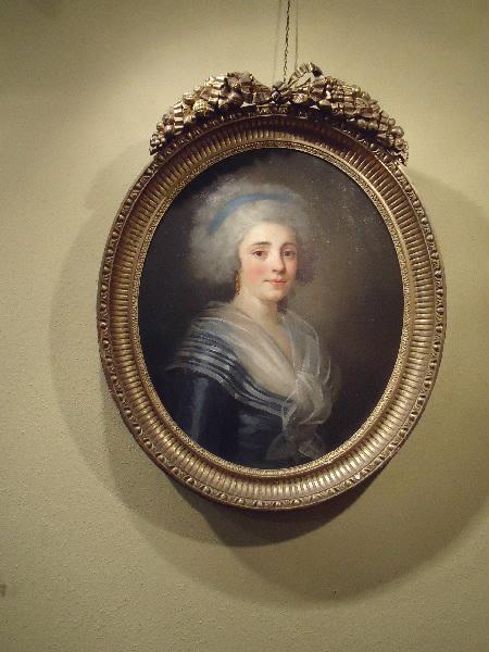 Portrait d'une jeune femme non identifiée. Présentée à mi-buste de trois-quarts face, elle porte une robe bleue et un modeste foulard de linon sur le décolleté. Le ruban dans ses cheveux poudrés s'assortit à la robe. Les carnations claires et rosées des joues et des lèvres répondent aux sourcils et aux yeux bruns inquiets. technique très lisse avec de légers empâtements pour les effets du châle.