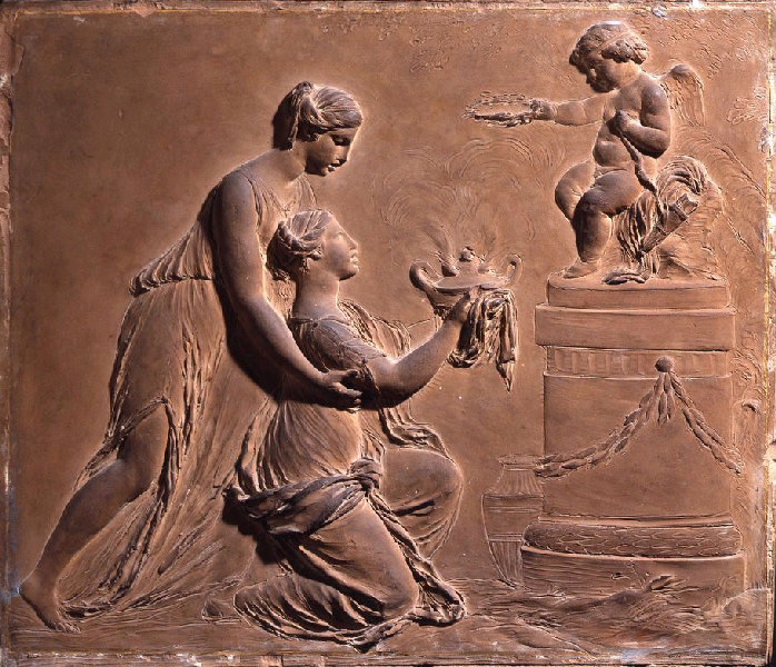 C'est lors de son séjour à Rome entre 1762 et 1771 que Clodion réalise cette oeuvre en terre cuite. Les petits bas-reliefs consacrés à l'Amour mettant en scène des éléments significatifs du retour à l'Antique font sa célébrité : l'Amour ailé, les profils grecs des femmes, les plis vibrants, serrés et contrastés des étoffes. Oeuvre en rapport : Le –sacrifice à l'Amour, vers 1773, bas- relief en marbre, 26x30,7 cm, Paris, musée des Arts Décoratifs