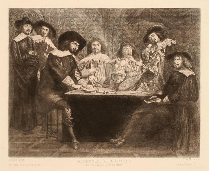 lettre, dans la marge inférieure à gauche : Lenain pinx. et au centre : ASSEMBLEE DE NOTABLES et à droite : T. de Mare sc./ à gauche : Gazette des Beaux-Arts et au centre : (Collection de Mme (me en exposant et - sous me) Kestner) et à droite : Imp. A. Clément-Paris