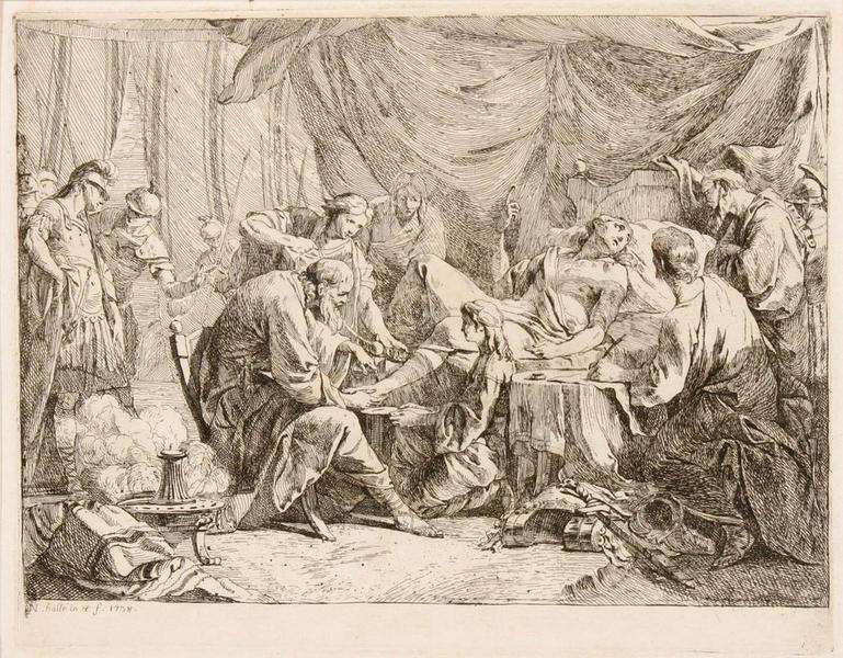 scène historique (Antiochus, homme, blessé, femme, lit, draperie, soldat, roi, intérieur : tente)