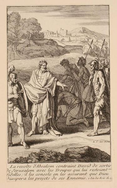 lettre, en bas à droite : L. C. inv. et scu ; lettre, sous le trait carré : La revolte d'Absalom contraint David de sortir / de Jerusalem avec les Troupes qui lui restoient / fidelles ; il les console en les assurant que Dieu / dissipera les projets de ses Ennemis. 2. Liv. des Rois ch.15