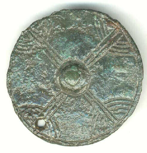 Fibule discoïde à umbo central décoré de triples incisions se développant en croix. Une perforation est présente sur le pourtour de la fibule