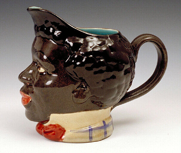 Cruche en faïence fine recouverte de glaçures colorées (majolique). Cruche représentant la tête d'un personnage de race noire portant une chemise à carreaux bleus et un noeud papillon bordeau