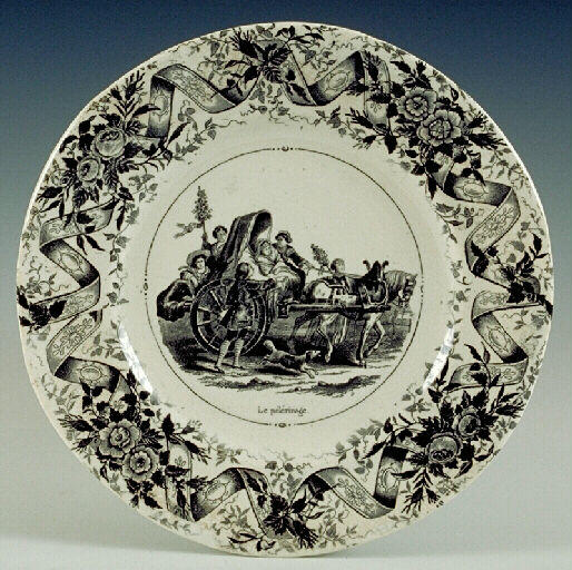 Assiette à décor imprimé à bord festonné comportant six grandes et six petites doucines. Le talon est arrondi. La vignette du bassin représente une carriole tirée par un cheval sur laquelle ont pris place des enfants. Sous la bâche, un enfant vraisemblablement malade est soigneusement emmitouflé dans une couverture. Légende : 'Le pèleinage'. N° 2 de la série. L'aile de couleur noire est ornée d'une frise constituée d'un ruban et de bouquets de fleurs