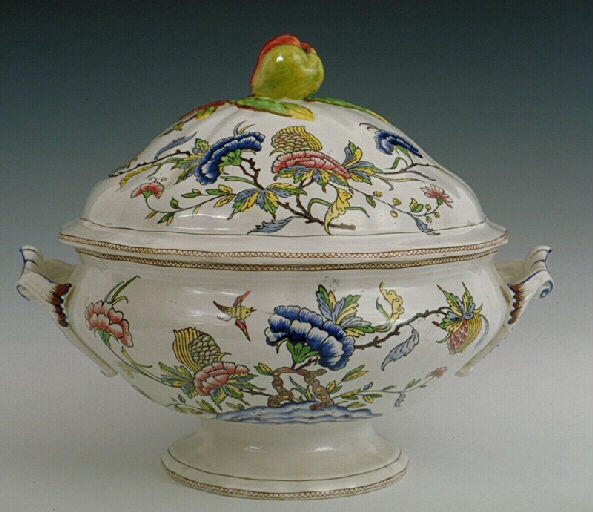 Eléments du service 'Rouen' : - 14 assiettes plates - 6 assiettes à dessert - 1 plat rond - 2 plats quadrangulaires - 4 raviers -1 moutardier sans son couvercle - 1 saladier sur piédouche - 2 saucières - 2 plats à ragoût - 1 saladier - 1 soupière. Le décor est constitué de gros oeillets peints en rouge et en bleu et de grenades. Au premier plan, sur une terrasse, on a figuré en brun un rocher percé au profil multilobé. Des oiseaux et des papillons viennent agrémenter l'ensemble. Le bord est souligné par un galon d'arceaux entrecroisés. La forme est Renaissance. Les pièces de forme sont portées par un piédouche aux moulures rocailles ; les anses en forme de poignée portent en leur centre une coquille. Les prises des couvercles sont en forme de poire