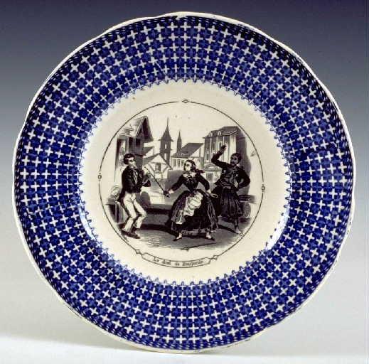 Assiette décorative à décor de transfert imprimé. L'aile est bleue, le fond est noir. Le duel de Benjamin. Une jeune femme tenant une épée vient de désarmer un jeune homme. Derrière elle, un zouave s'esclaffe. L'aile est ornée d'un réseau imitant le cannage