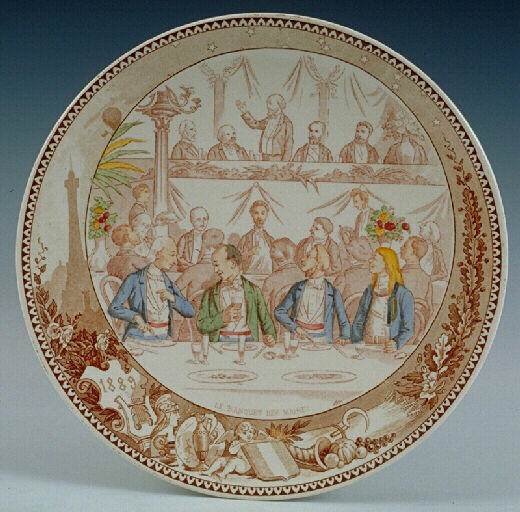 Assiette d'une série consacrée à l'exposition universelle de 1889 à Paris. Dans une vignette décentrée est représentée une scène de l'exposition en gravure rose rehaussée de couleurs tout autour ; sur le fond de l'assiette sont représentés différents produits évoquant l'exposition : gerbe de blé, corne d'abondance avec des fruits, céramiques, statuette, une lyre, un cartouche avec la date 1889 et au fond dans un paysage la silhouette de la Tour Eiffel. N° 10 : plusieurs tables où sont attblés des maires ceints de leur écharpe tricolore. Au fond, sur une estrade, un personnage debout est en train de prononcer un discours. Légende : 'Le banquet des maires'