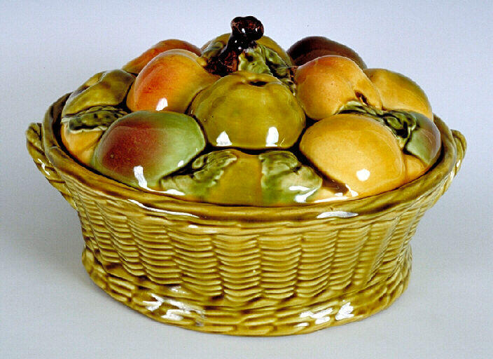Panier en faïence avec pommes traité en trompe-l'oeil sur le couvercle. Le panier d'osier est muni de deux anses et d'un émail vert ; le couvercle formé par les pommes possède un bouton de préhension constitué par une branche