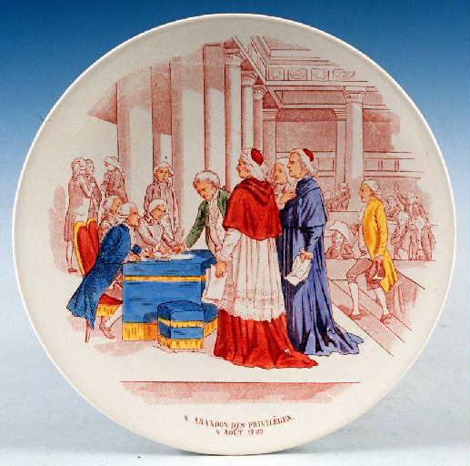 Assiette en faïence fine blanche de forme lentille à décor imprimé en sépia rehaussé consacrée à la révolution française. La scène représente des nobles et des ecclésiastiques signant des documents à un bureau derrière lequel se tiennent trois personnages ; la scène se déroule dans une grande salle à colonnade. Inscriptions 'Abandon des privilèges. 4 août 1789'