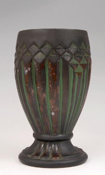 Vase en grès émaillé de l'atelier Mougin frères à Nancy. Il est de forme ovoïde sur un piédouche et revêtue d'un émail noir mat rehaussé de vert et de brun. Sous le bord, frise de triangles en relief avec, en dessous, des godrons verticaux. Modèle n° 310 J.