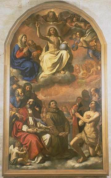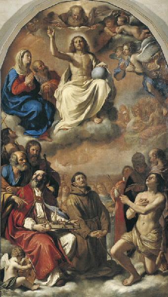 Peinte en 1647, cette toile fut réalisée alors que le Guerchin s'était établi à Bologne, où il finira sa vie. Le tableau est divisé en deux registres bien distincts : dans la partie supérieure, le Christ trône entouré du Père, d'anges, de saint Joseph et de la Vierge, alors que dans la partie inférieure sont regroupés les saints protecteurs de la ville de Modène (saint François d'Assise, saint Géminien, saint Pierre, saint Paul, saint Jean-Baptiste, saint Sébastien, saint Grégoire, saint Jérôme et saint Etienne). Derrière les saints protecteurs, une foule d'élus se distingue, dans des tons beaucoup plus fondus. D'une facture délicate, ce tableau présente des contrastes colorés et lumineux encore très forts, bien qu'adoucis par rapport aux oeuvres plus anciennes du peintre. Un éclairage venu de la gauche permet de souligner les carnations des corps du Christ et de saint Sébastien, et d'appuyer sur la richesse des draperies des costumes de saint Géminien, de la Vierge et de saint Pierre. Dans une composition très soignée, le Guerchin introduit des raffinements qui annoncent, en de nombreux points, le XVIIIe siècle.