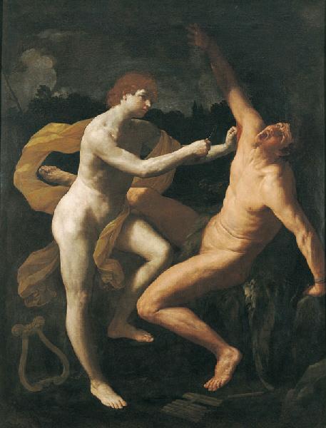 provient du Palais royal de la Galerie des ducs de Savoie de Turin. Suivant l'impulsion donnée par les Carrache, Guido Reni rejette l'abstraction maniériste de la fin du XVIe siècle, et célèbre dans ses toiles le culte de la beauté, en excluant de ses tableaux toute laideur et toute vulgarité. Dans cette scène issue de l'Antiquité grecque, Apollon écorche Marsyas pour l'avoir défié à la flûte. Malgré l'horreur de la scène, Guido Reni reste fidèle à son idéal de beauté et de perfection. Il construit une composition basée sur une opposition totale entre les deux personnages : la coloration blanche de la divinité contraste avec la carnation dorée de Marsyas. Par ailleurs, Apollon, comme beaucoup des sujets les plus cruels de Guido Reni, affiche une sérénité qui ne fait que mieux ressortir le visage contracté par la douleur et le corps renversé de Marsyas. Cette carnation très blanche d'Apollon, qui lui donne une dimension immatérielle, a souvent été mal comprise, et on a dit de son personnage qu'il n'était qu'ébauché ou inachevé (Catalogue Lucas, 1806, p.28).