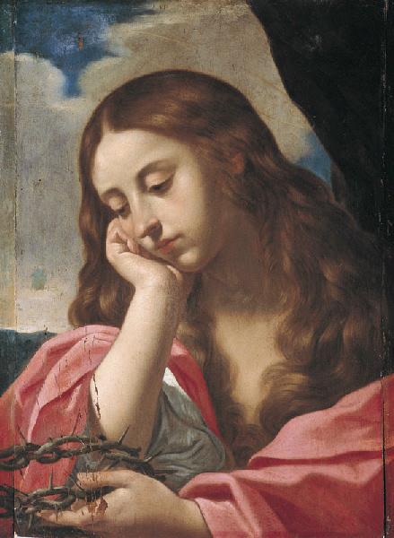 figure biblique (sainte Madeleine, en buste, de trois-quarts, Couronne d'épines) ; grotte