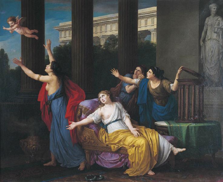 scène (à l'antique, Cupidon : en vol : fuite, groupe : jeune fille, désespoir, palais : intérieur, statue, cage, fauteuil, objet d'ornement : parfum) ; portique