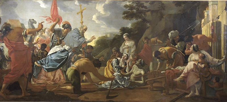 scène historique (sainte Hélène, La Croix, résurrection, attroupement, évêque, soldat, enfant : Noir, famille, litière) ; fond de paysage