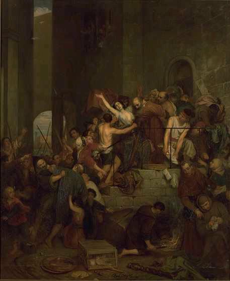 scène (Venise, Moyen Age, émeute, famille : Juif : expulsion, maison, escalier, quartier)