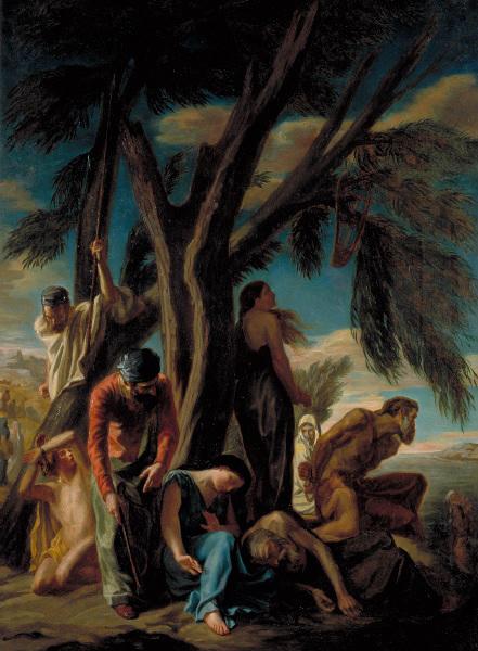 scène biblique (groupe, Israélite, captif, halte, arbre, lyre)