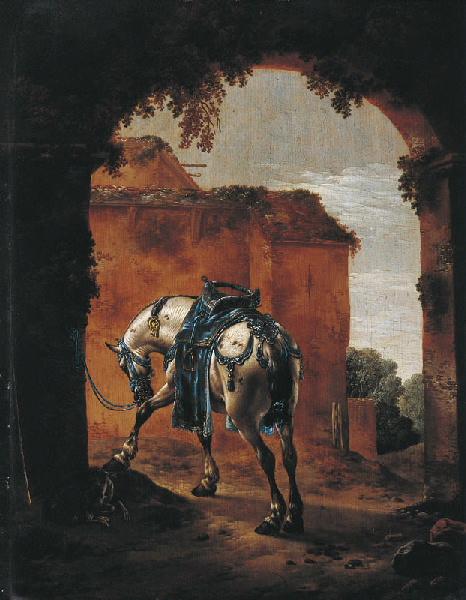 représentation animalière (cheval, harnachement, arcade, maison, lévrier)
