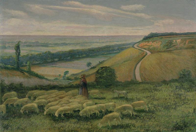 paysage (prairie, colline, bergère, femme, champ, berger, homme, mouton)