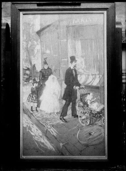 scène (promenade, famille, voiture d'enfant, nourrisson, fillette : costume de communiant, rue, Paris)