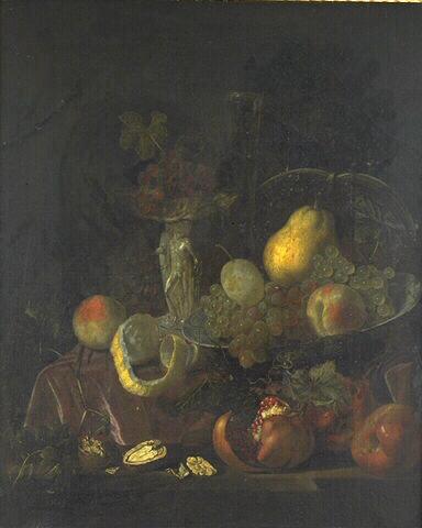 nature morte (fruit, pomme, grenade fruit, noix, pêche fruit, citron, prune, raisin, poire, plat : céramique, plat : orfèvrerie)