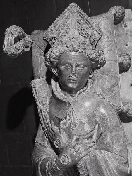 figure (Tissendier Jean, homme, allongé, sur le dos, cheveux, chape, chasuble, manteau, tunique, crosse, mitre, gant, bijou, évêque) ; coussin (écu, en médaillon) ; armoiries (croissant de lune, coquille Saint-Jacques)