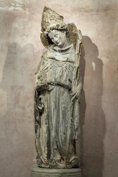 Groupe d'apôtres provenant de la chapelle de Rieux. Saint Louis d'Anjou, évêque de Toulouse est représenté la tête légèrement penchée et tournée à droite, la jambe gauche fléchie; il tient dans sa main droite un livre à reliure ornée de clous quadrilobés et de la gauche une crosse brisée. La mître et le mors du manteau sont d'une grande richesse, on distingue sa cordelière aux trois noeuds le long de son flanc droit.