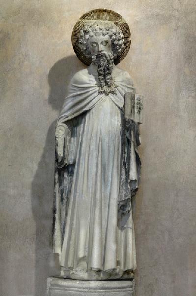 figure biblique (Apôtre, homme, en pied, cheveux, barbe, auréole, manteau, bijou, tunique, présentation, livre)