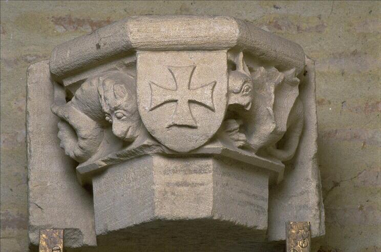 Chapiteau orné d'un écu portant une croix pattée