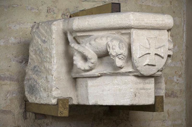 représentation animalière (dragon, hybride) ; écu (croix pattée)