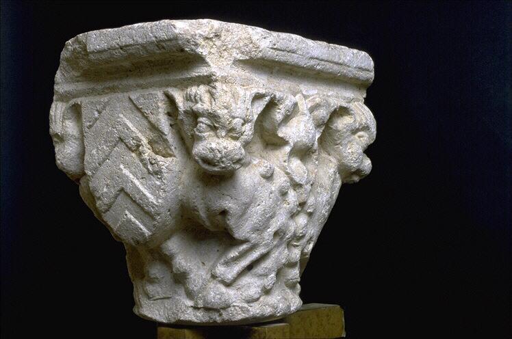 voir aussi : Chapiteau orné d'un écu portant une croix pattée (RA 536) , Chapiteau orné de visages (RA 535 C) , Chapiteau orné de monstres (RA 535 B) ; Numéros d'inventaire des autres éléments : RA 536, RA 535 C, RA 535 B. Ces deux derniers sont associés par analyse stylistique.