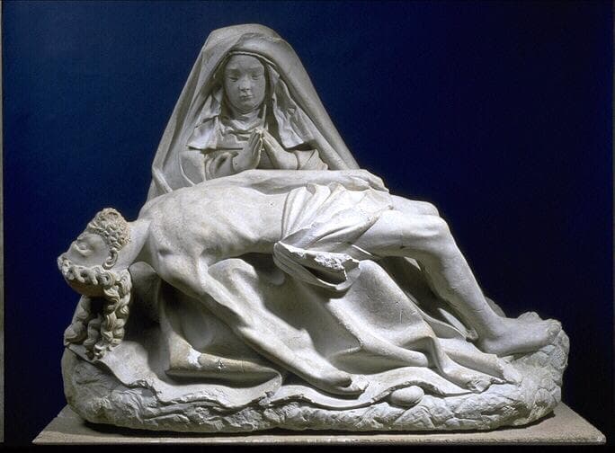 Selon Roger Camboulives, cette Pietà proviendrait de l'ancienne église de Candie, paroisse du vieux village de Toulouse (actuellement commune de Toulouse). Après son abandon en 1775 cette église fut détruite.