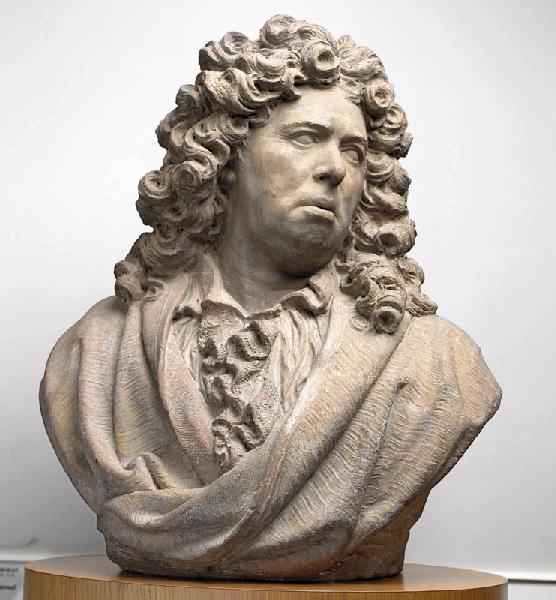 le visage est tourné vers la gauche. La perruque est abondante et tombe sur les épaules. Draperies se croisant sur le torse, laissant apparaître le jabot de la chemise.