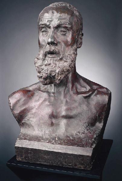 De face, la tête très légèrement relevée, regardant droit devant. Le torse est légèrement en biais, l'épaule droite en avant. Calvitie prononcée, seulement quelques cheveux très plats sur l'arrière et les côtés de la tête. Moustaches et barbe dures. Homme âgé, visage ridé et noueux. Torse nu, le socle de bronze est dans le prolongement.