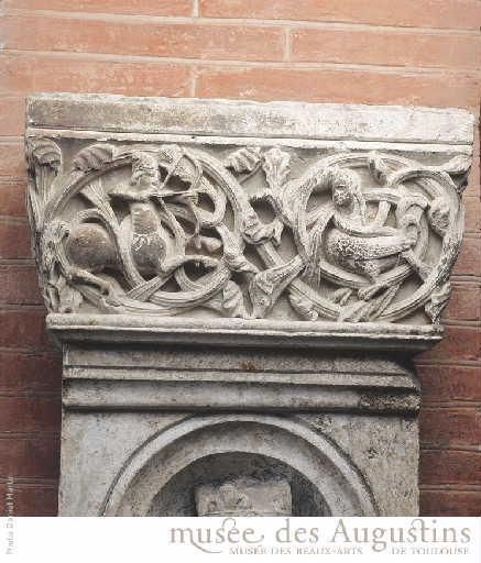 provient du portail de la salle capitulaire du prieuré de Sainte-Marie-de-la-Daurade, démoli en 1811, 1812 ; voir aussi : Le roi david accordant sa harpe (ME 80) Exposé ensemble - Salle romane, 1996 ; Numéro d'inventaire de l'autre élément : RA 452 B (ME 80).