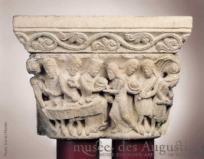 Provient peut-être du cloître de Saint-Etienne ; Datations de l'ensemble variant de 1115 à 1160 ; voir aussi : tailloir de chapiteau de colonnes jumelles appliquées (ME 32) Exposé ensemble - Salle romane, 1996