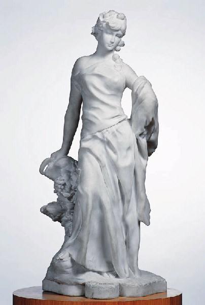 figure (allégorie : automne, femme, en pied, robe, couronne : feuille, faucille, vigne)
