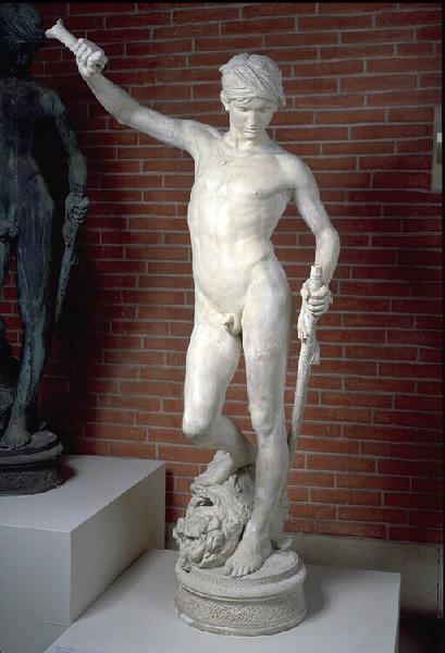 figure biblique (David, jeune homme, nu, coiffe, en pied, tête : Goliath, épée)