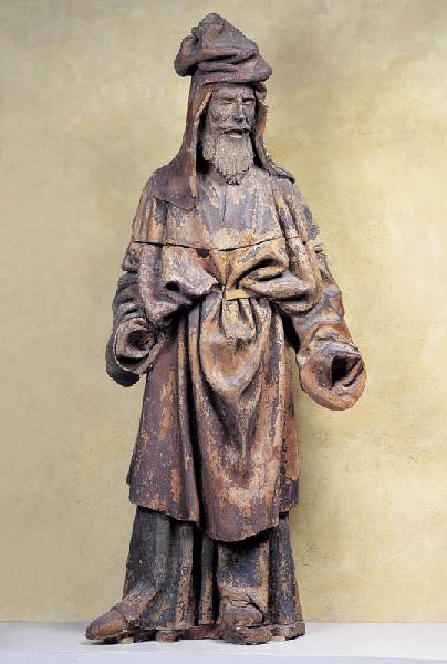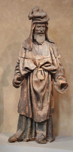 figure (homme, en pied, barbe, couvre-chef, tunique, manteau, ceinture, chaussure, expression du visage)