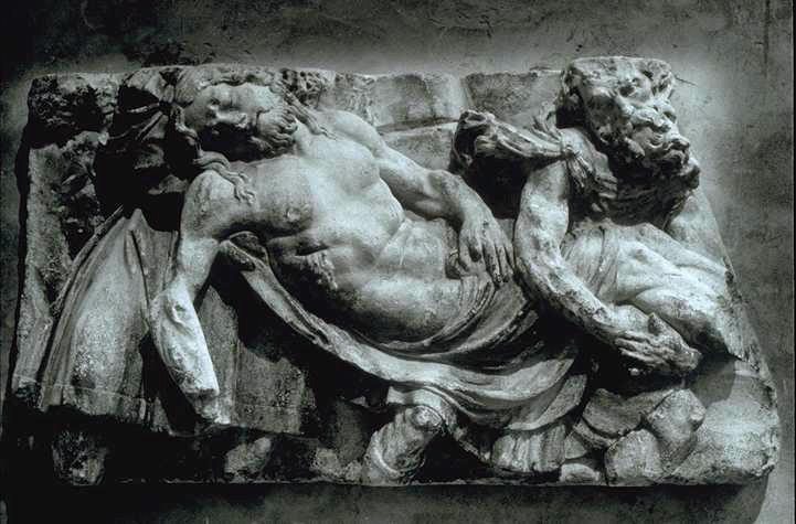 Bachelier fut à l'origine de l'essor de la Renaissance à Toulouse. Il participa à la décoration de nombreux édifices religieux comme ceux de la Daurade, de la Dalbade, des Jacobins ou des Cordeliers. L'emplacement d'origine de ce fragment de bas-relief reste incertain, on suppose qu'il vient du couvent des Cordeliers où Bachelier avait effectivement exécuté une clôture de choeur avec des bas-reliefs. Ce fragment très incomplet présente deux personnages en marche portant le corps du Christ mort. De celui de gauche on ne voit qu'une partie de la tunique, de celui de droite, qu'une tête barbue tronquée et une partie des bras qui soutiennent les jambes du Christ. Celles-ci et sa main droite sont amputées. Malgré ces nombreuses mutilations, cette composition reste équilibrée et d'une grande qualité. Le modelé des corps et le rendu des drapés sont les témoins de la grande habileté d'exécution de l'artiste, et les visages très expressifs contribuent à souligner l'intensité dramatique de la scène.
