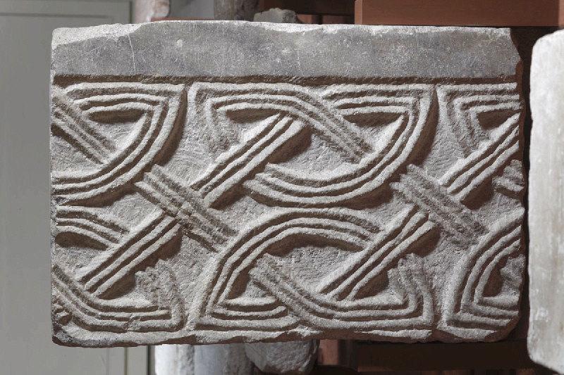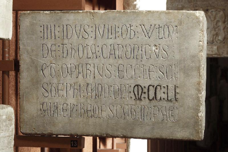 épitaphe d'un chanoine mort en 1251, gravée au dos d'un fragment de dalle portant un décor carolingien, provenant peut-être du chancel de la cathédrale Saint-Etienne à Toulouse