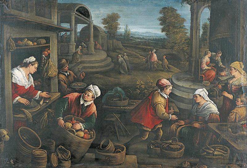 scène (place, marché, commerçant, homme, femme, enfant, chien, vaisselle, récipient, panier, tonneau, table, repas) ; fond de paysage
