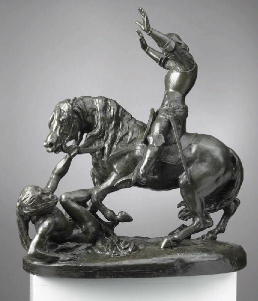Le jeune roi lève les bras, dans un mouvement de frayeur, alors que son cheval se cabre, dans des élans contrariés.