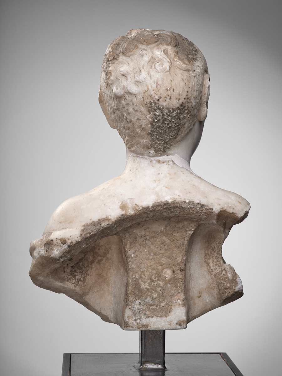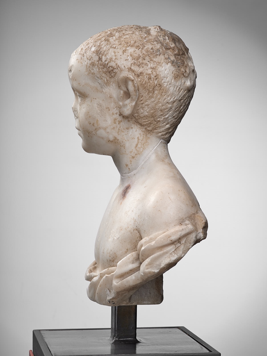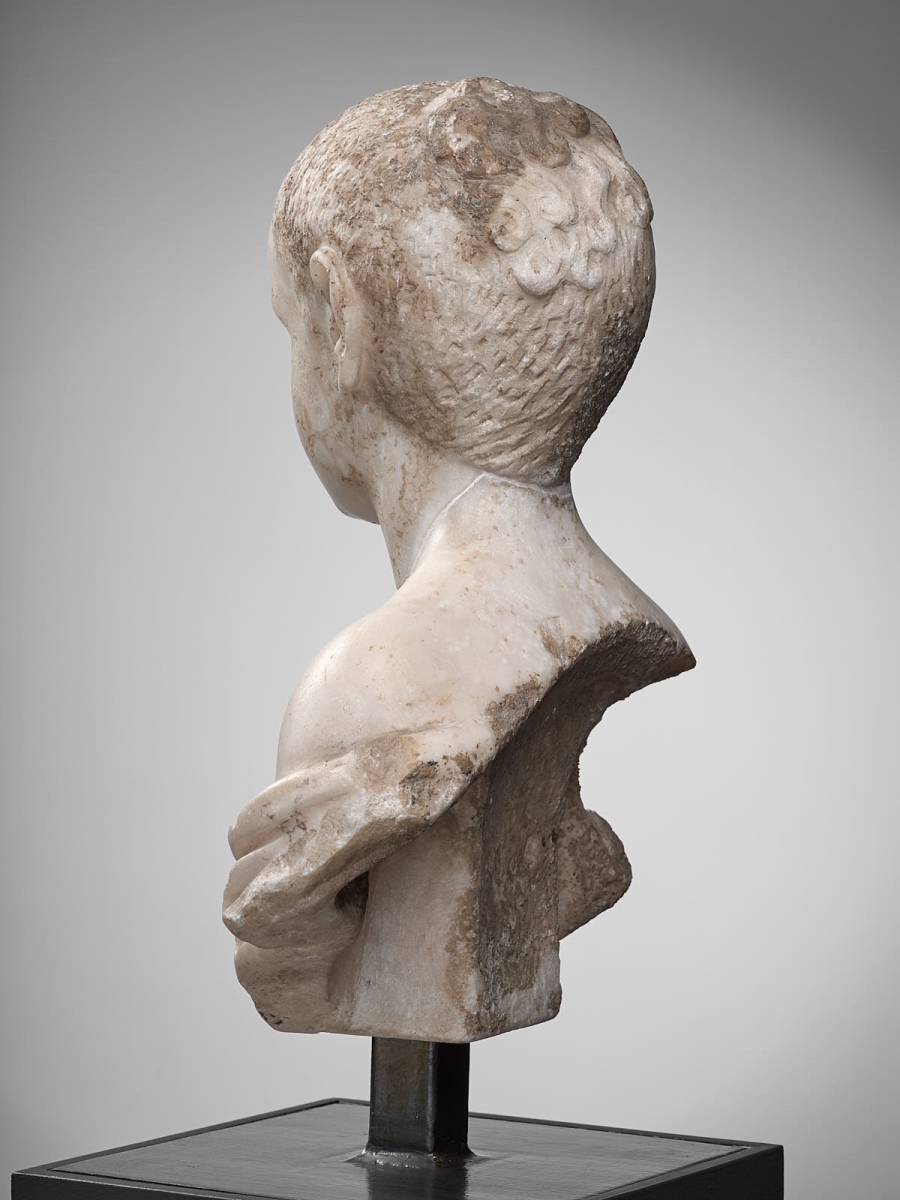 La chevelure rase de cet enfant paraîtrait similaire à bien d'autres de cette époque si elle ne présentait pas une particularité à l'arrière du crâne : une touffe de cheveux. Il s'agit là peut-être de l'indication de la consécration de cet enfant à la déesse égyptienne Isis et à sa relation avec le dieu-enfant Harpocrate. Ces divinités sont par ailleurs bien présentes à Chiragan. Pascal Capus, 2015. ; Marbre d'Afyon (Turquie) La chevelure rase de cet enfant paraîtrait similaire à bien d'autres de cette époque si elle ne présentait pas une particularité à l'arrière du crâne : une touffe de cheveux. Il s'agit là peut-être de l'indication de la consécration de cet enfant à la déesse égyptienne Isis et à sa relation avec le dieu-enfant Harpocrate. Ces divinités sont par ailleurs bien présentes à Chiragan. ; L'oeuvre est ici présentée telle qu'elle a été trouvée à la fin du XIXe siècle. Elle a seulement été débarrassée, à deux reprises, entre 1891 et 1950, des concrétions dues à un long séjour dans la terre. C'est ce que montre la photographie ancienne reproduite ici qui a saisi le buste juste après la fouille. Plusieurs chocs avaient mutilé la partie droite du buste, le nez, l'oeil gauche, le front et séparé la tête, brisée à la base du cou. Le travail de la chevelure, rase et dont les petites mèches sont traitées à penna, comme sur beaucoup de portraits du IIIe siècle, présente une particularité : sur la nuque, une touffe de cheveux, sculptée différemment, paraît comme réservée par le coiffeur. Doit-on voir là le signer d'une retaille de la coiffure ou bien, comme nous l'a suggéré Jean-Charles Balty, l'indication de quelque pratique religieuse telle que la consécration de l'enfant à Isis ?