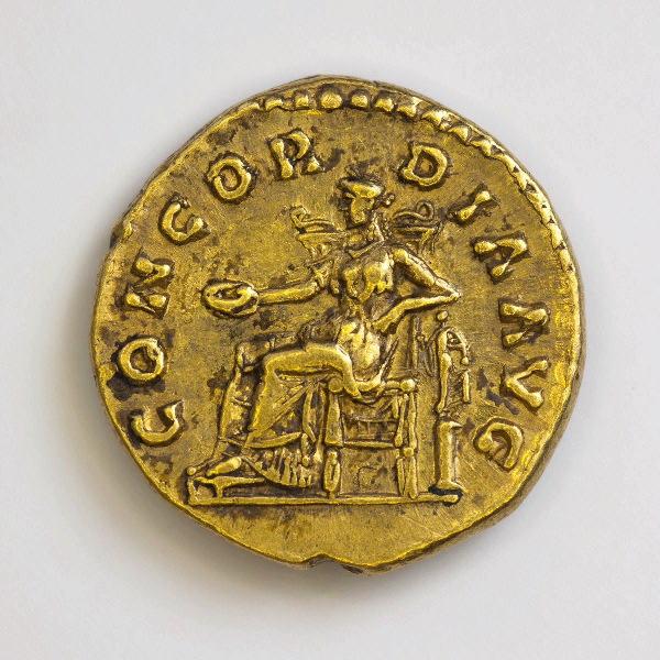 Revers : CONCOR-DIA AVG Concordia, assise à gauche, tient une patère de la main droite et repose son coude gauche sur une statuette de Spes (l'Espérance) dressée sur une colonnette.