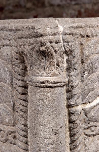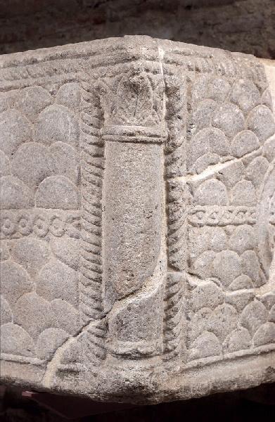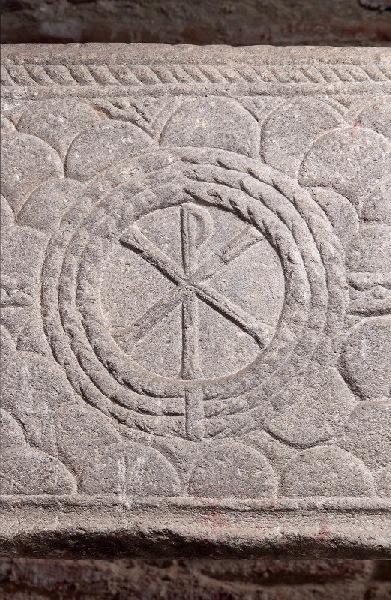Cuve de sarcophage ornée d'un chrisme et d'imbrications tournées vers le haut.